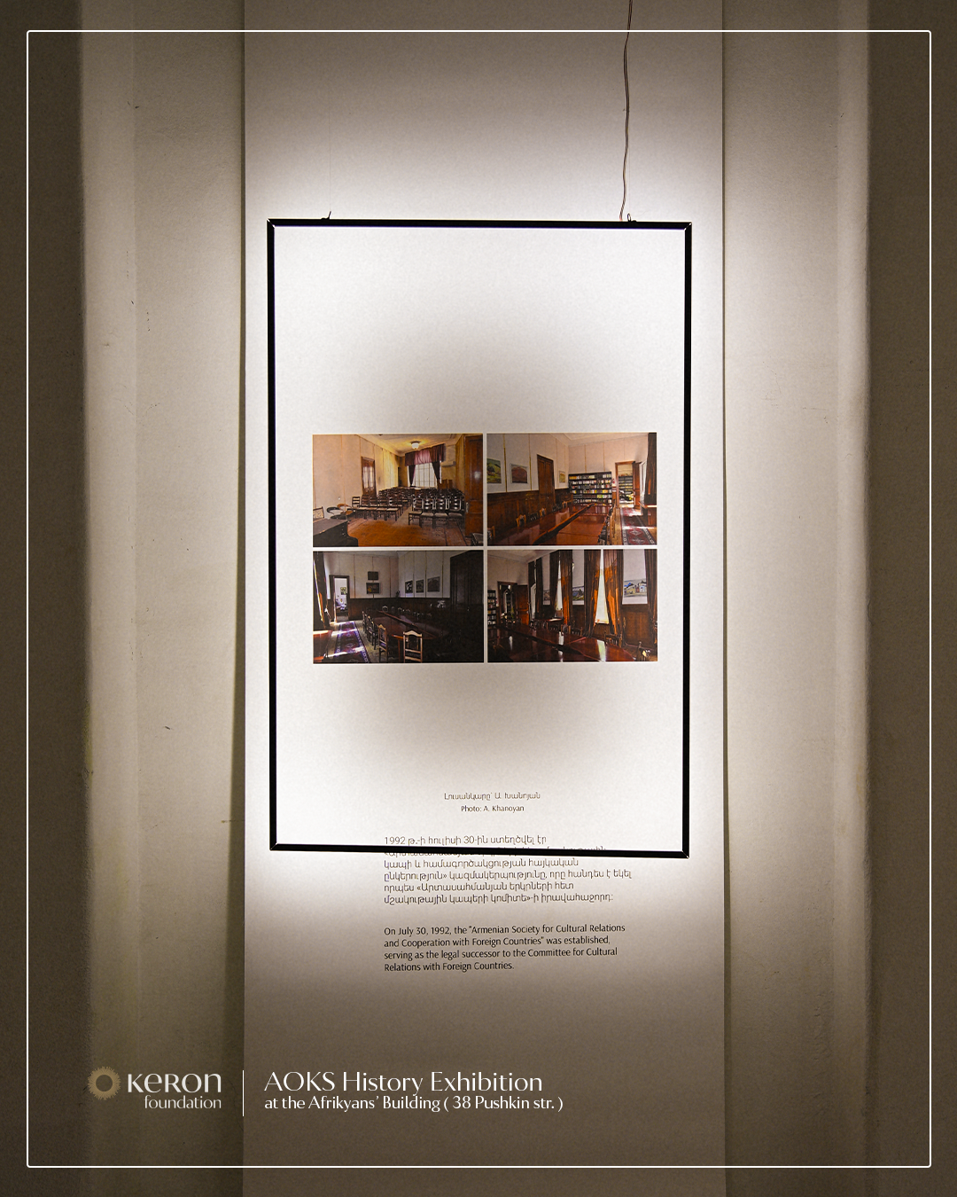 In 1944, the building was allocated to the Armenian Society for Friendship and Cultural Cooperation with Foreign Countries (AOKS), which contributed to the development of international cultural cooperation. A number of exhibitions, conferences, and cultural events were held here, along with the publication of the multilingual bulletin Armenia Today.